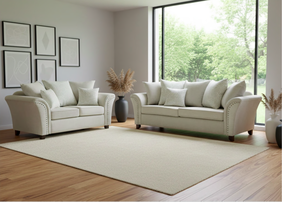 Conjunto de sofá y love seat en elegante tono, perfecto para cualquier estilo. Destaca por sus detalles metalizados, patas de madera y cojines lisos, creando una sala versátil y acogedora.